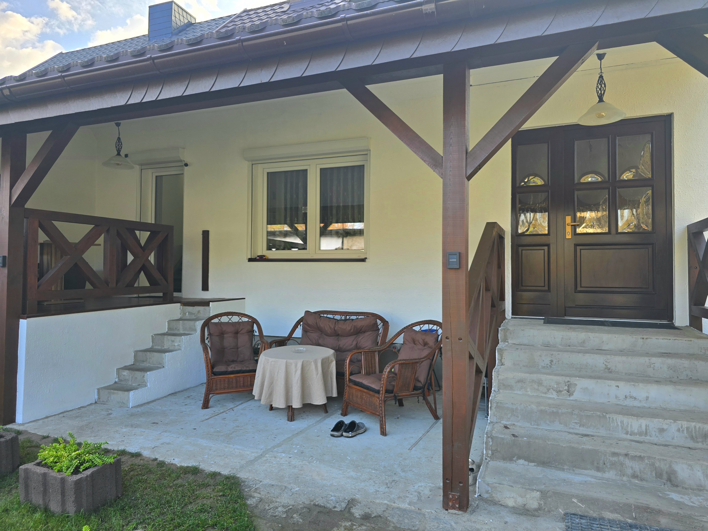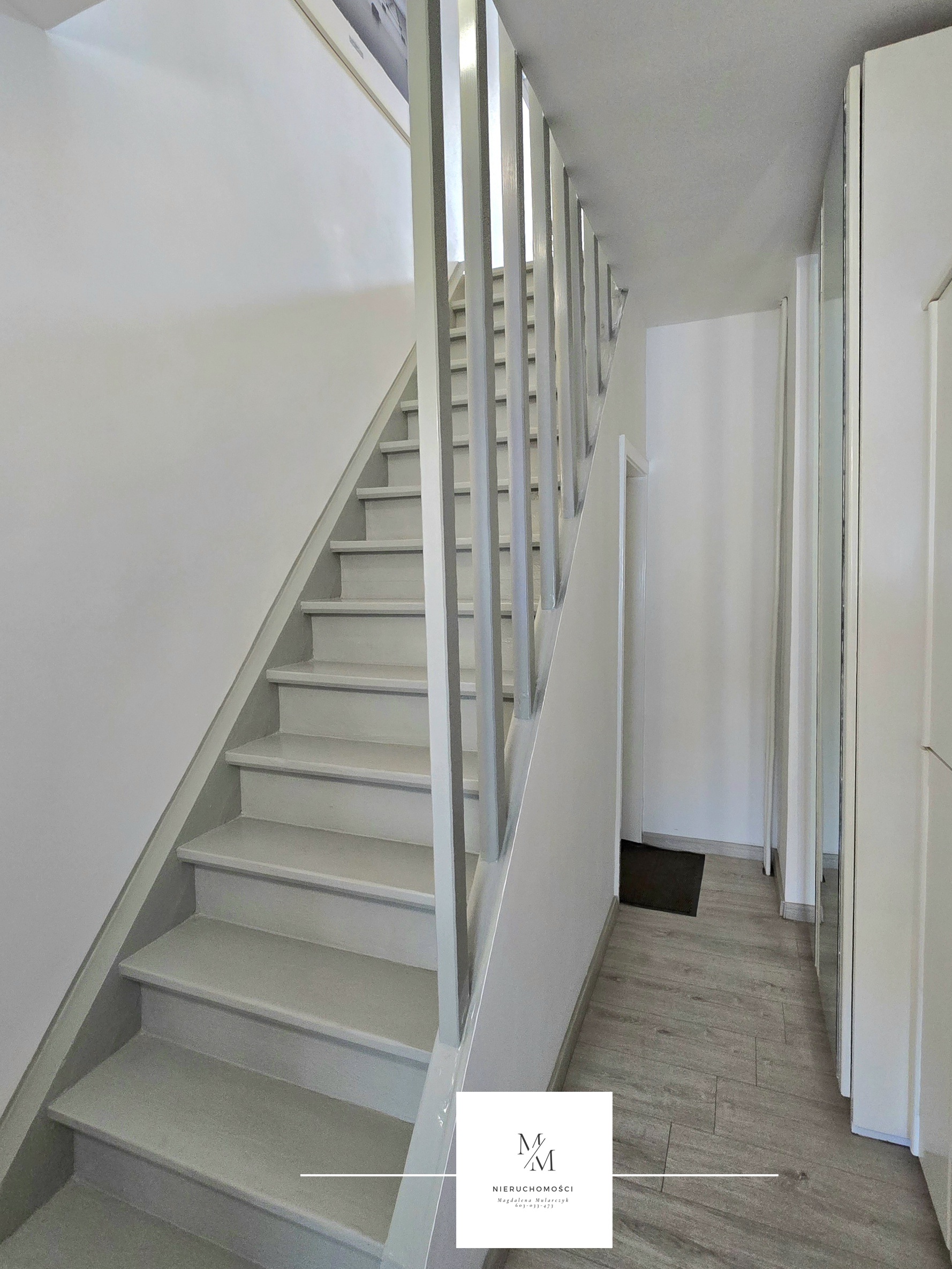 Z kuchni znajduje się wyjście na taras (przód domu i ogród), przechodząc dalej są schody którymi wchodzimy na poddasze domu.